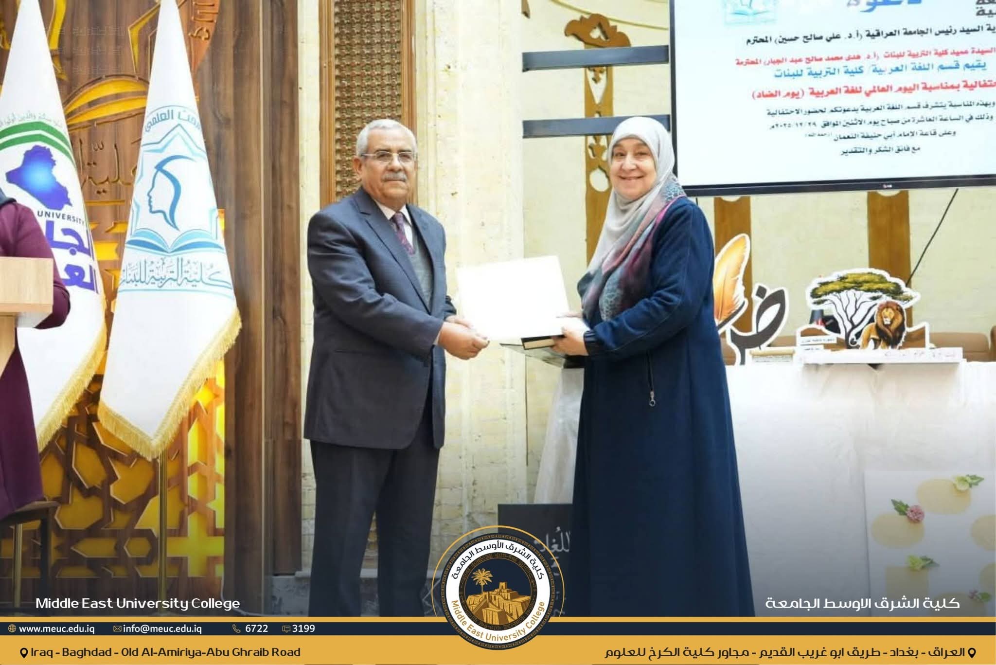 وفي ختام الاحتفالية، جرى تكريم ممثلي كلية الشرق الأوسط الجامعة بشهادات شكر وتقدير؛ تثمينًا لمشاركتهم الفاعلة ودورهم في دعم الأنشطة الثقافية والعلمية، بما يعزز التعاون الأكاديمي وخدمة اللغة العربية.