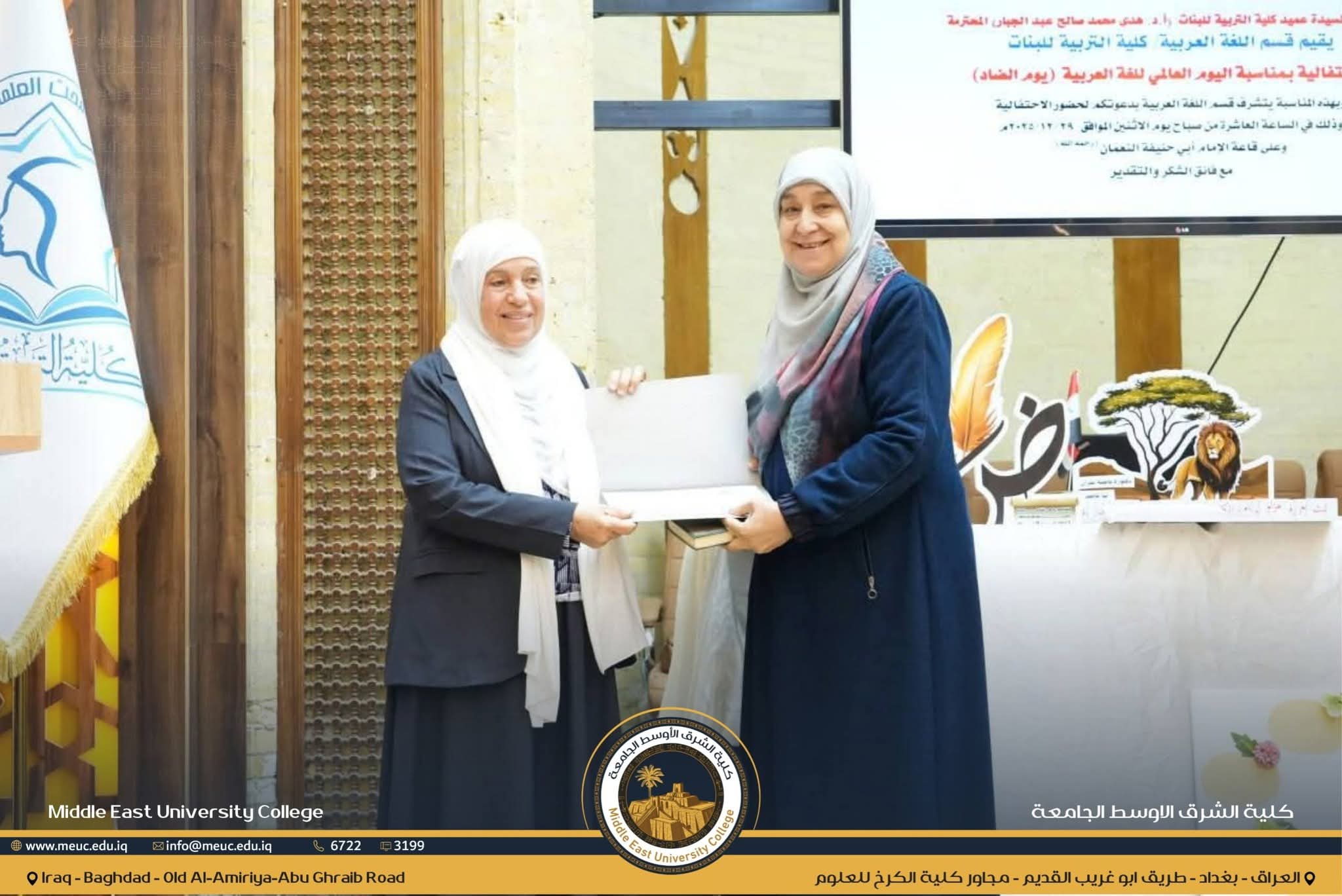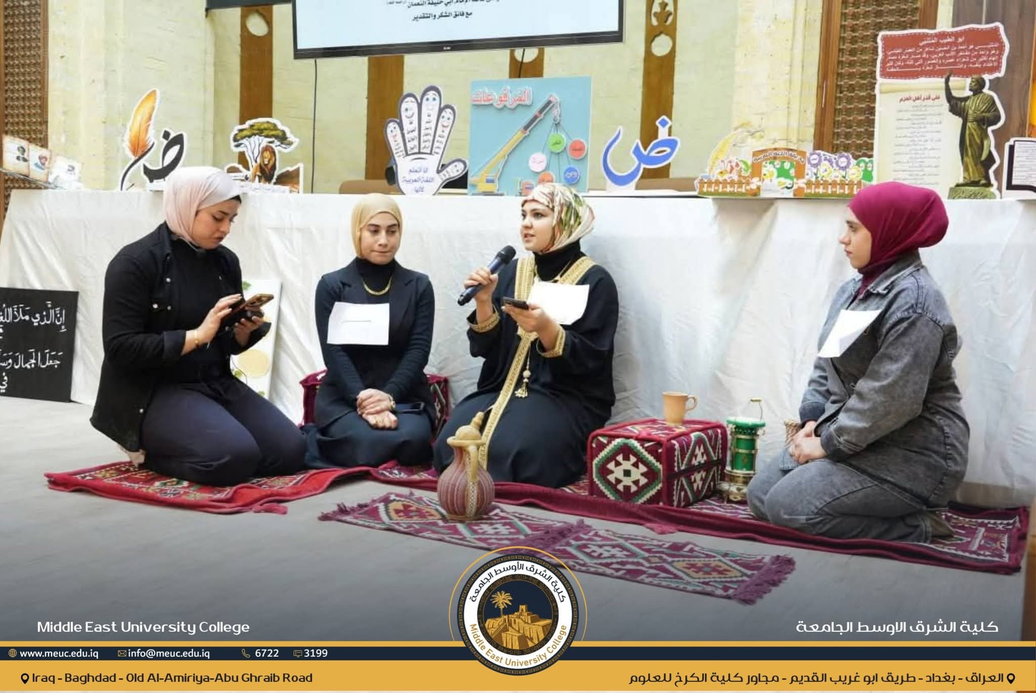 وشهدت الاحتفالية مشاركة كلية الشرق الأوسط الجامعة، بدعوة رسمية من الجهة المنظمة، حيث حضر كلٌّ من رئيس قسم اللغة العربية في كلية الشرق الأوسط الجامعة الدكتور عامر الهيتاوي، ورئيسة شعبة الترقيات العلمية الأستاذ الدكتورة مهدية صالح، إلى جانب تدريسيات القسم وطالباته، وتضمنت فقرات علمية وثقافية سلطت الضوء على جماليات اللغة العربية وثرائها.