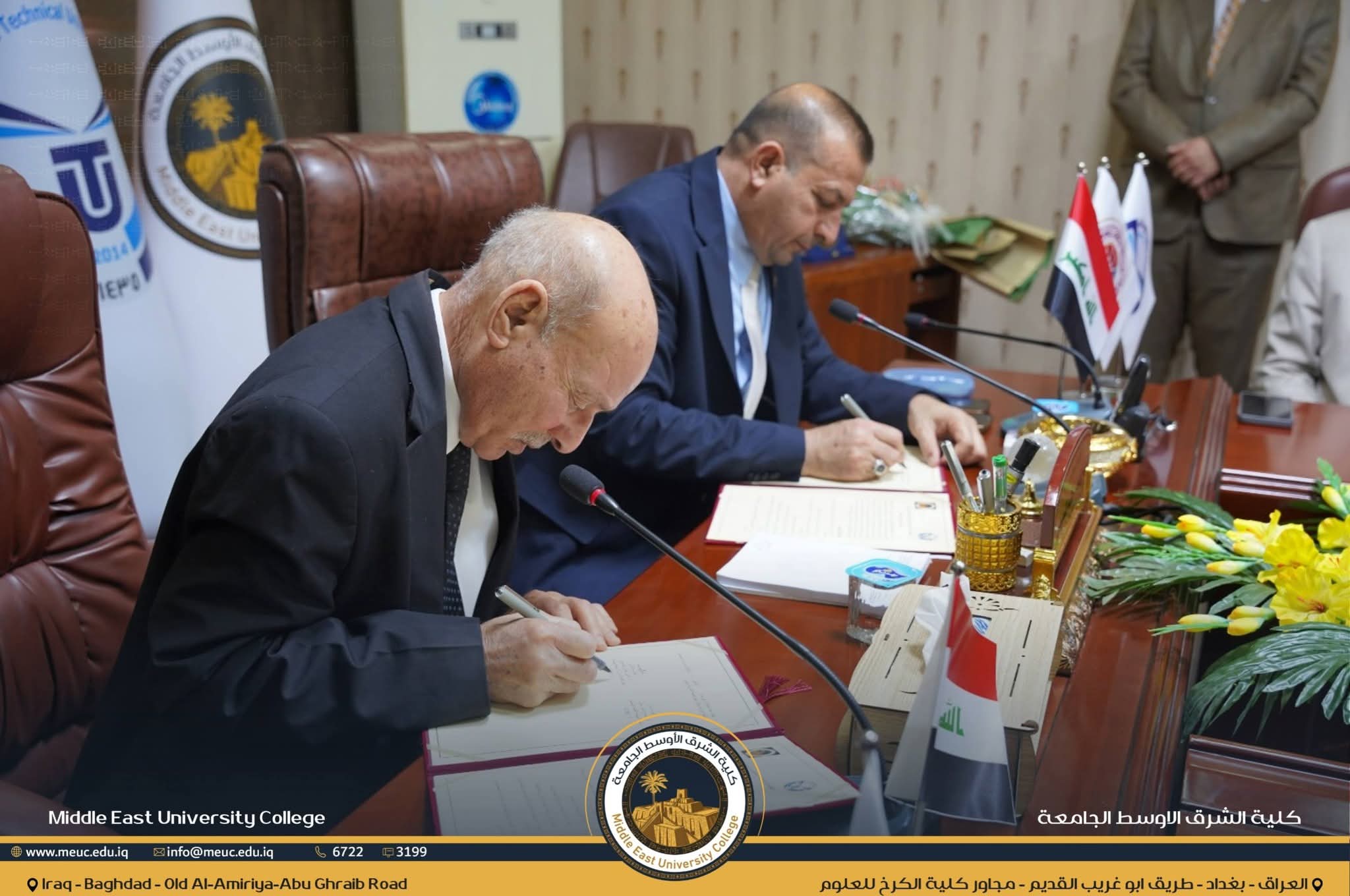 ووقّع المذكرة عن الجامعة التقنية الوسطى رئيسها الأستاذ الدكتور (وضاح عامر حاتم التميمي) ، فيما وقّعها عن كلية الشرق الأوسط الجامعة عميد الكلية الأستاذ الدكتور (مثنى علوان الجشعمي) ، بحضور معاون العميد للشؤون العلمية الدكتور (حمزة كاظم الزبيدي) .