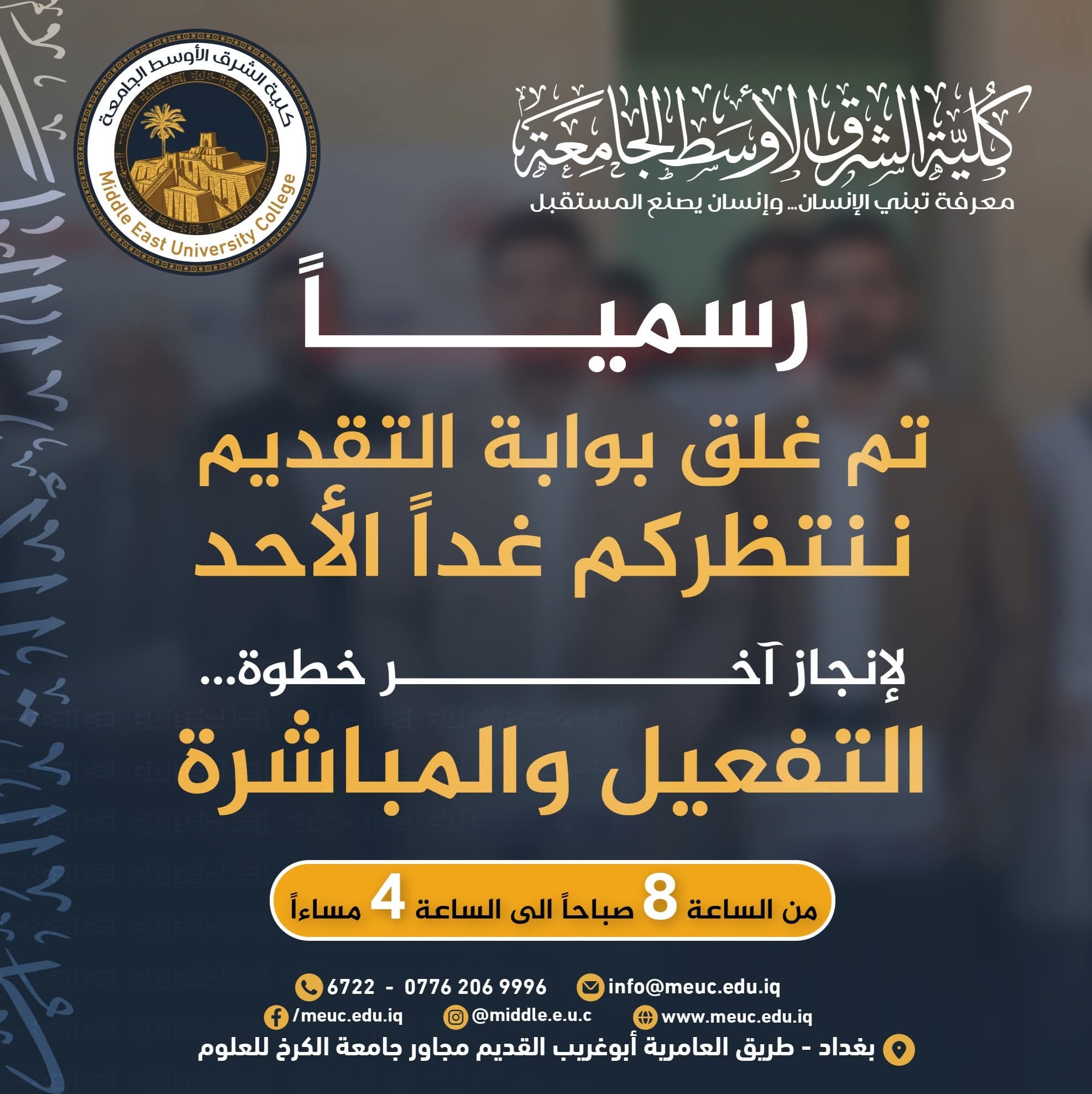 انطلاق الدوام الرسمي في كلية الشرق الأوسط الجامعة الساعة التاسعة صباحاً