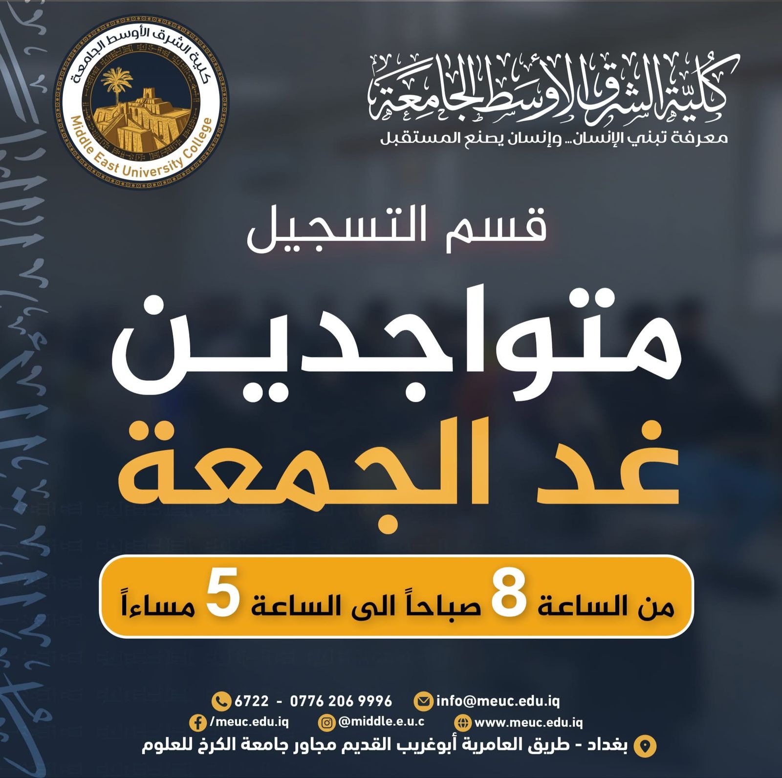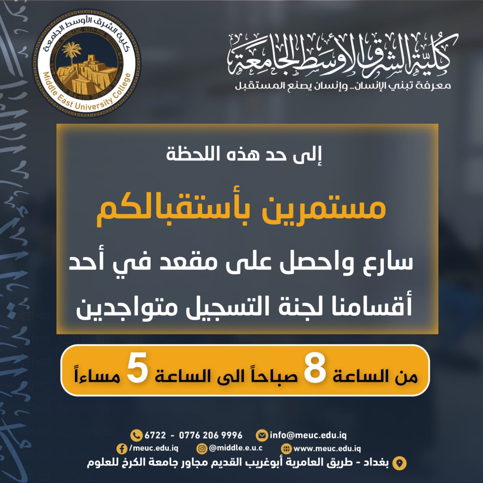 منذ ساعات الصباح الباكر، تواصل لجنة استقبال وتسجيل الطلبة استقبال طلبتنا الأعزاء وعوائلهم الكريمة في كلية الشرق الأوسط الجامعة