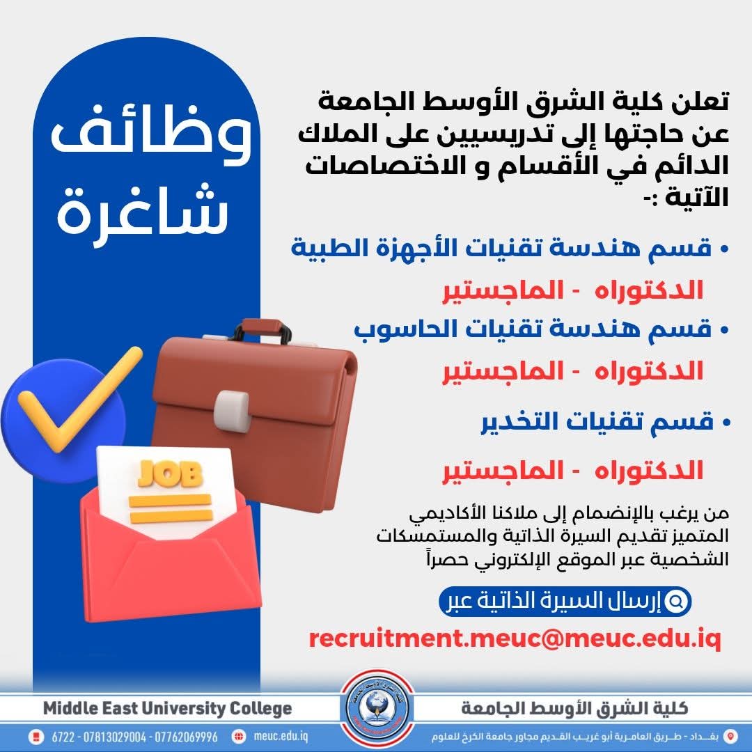 اعلان وظائف - قسم تقنيات التخدير في كلية الشرق الأوسط الجامعة