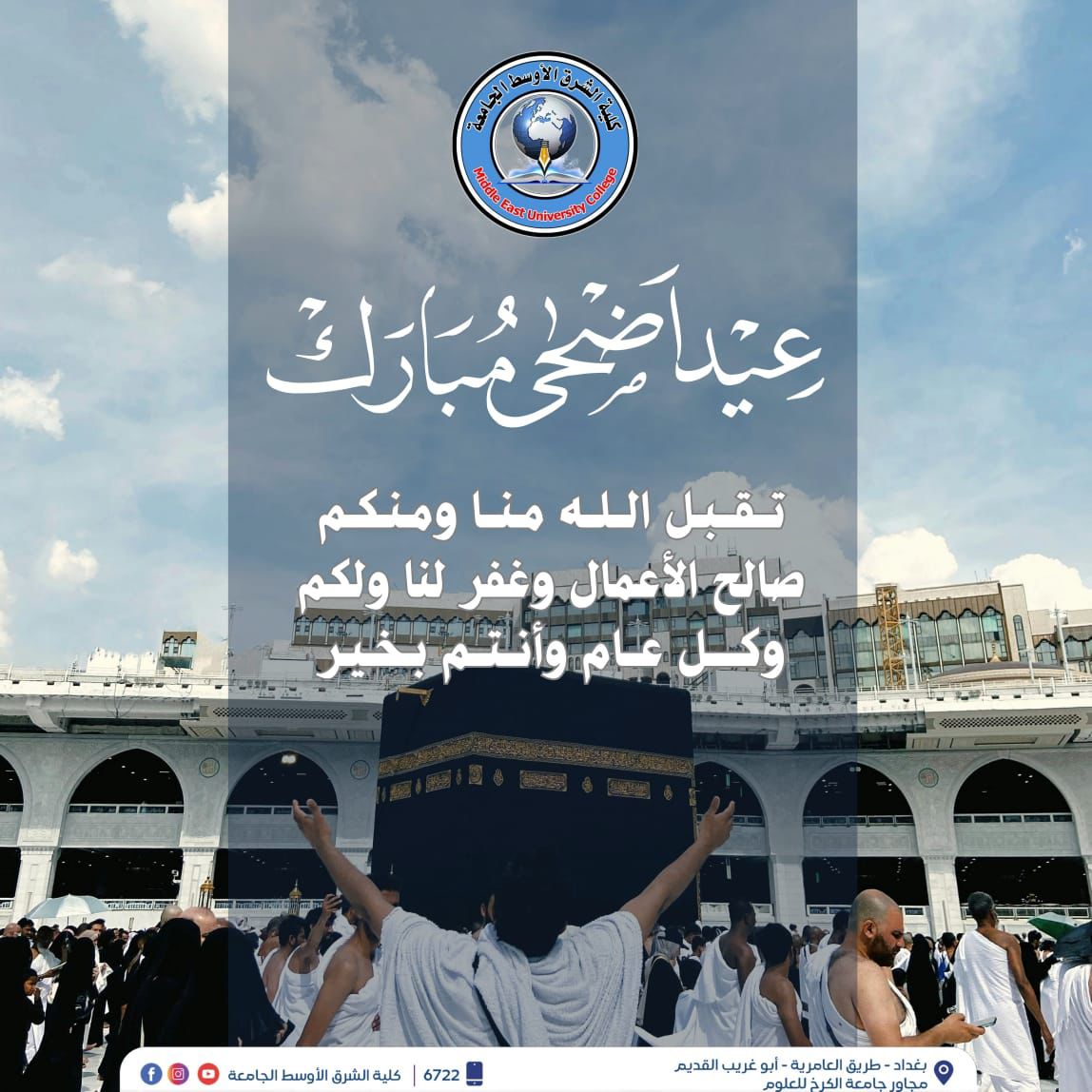 كلية الشرق الأوسط الجامعة تتقدم بأحر التهاني والتبريكات إلى الأمة الإسلامية جمعاء، بمناسبة حلول عيد الأضحى المبارك، سائلين الله أن يعيده علينا وعليكم بالخير واليُمن والبركات