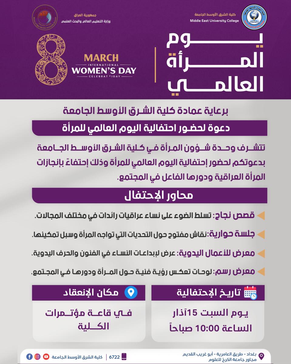 كلية الشرق الأوسط الجامعة تهنئ المرأة العراقية بمناسبة اليوم العالمي للمرأة