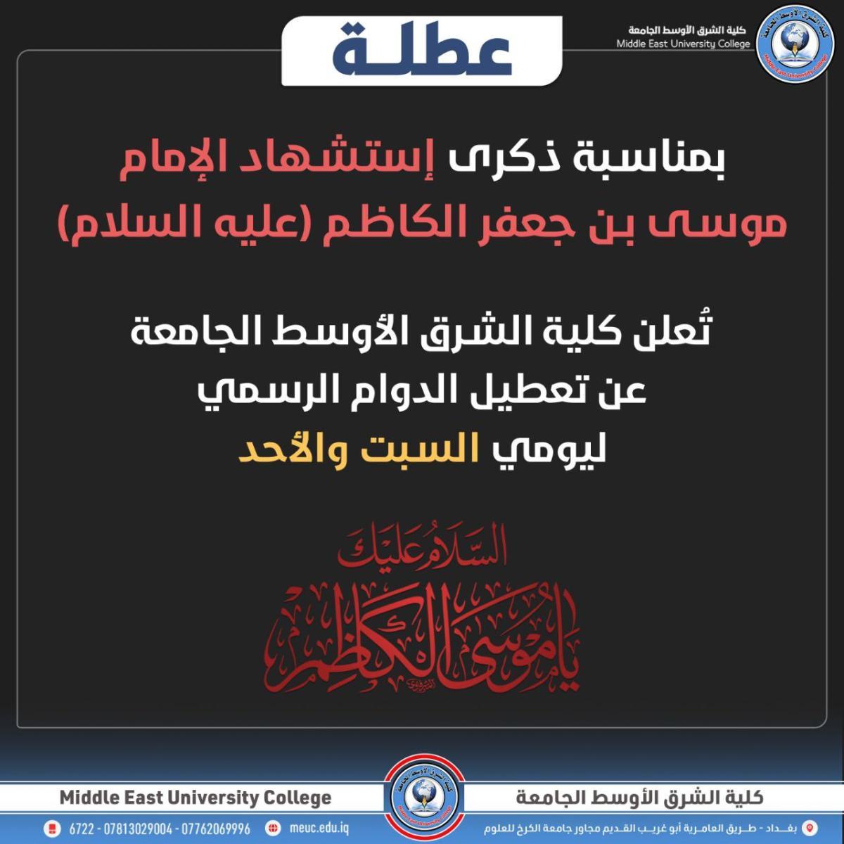 كلية الشرق الاوسط الجامعة تعطل الدوام الرسمي ليومي السبت والاحد بمناسبة استشهاد الامام موسى بن جعفر الكاظم ( عليه السلام )