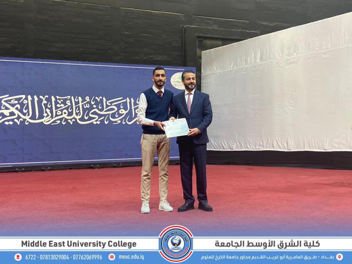 في إنجاز جديد يضاف إلى سجل كلية الشرق الأوسط الجامعة، كرم معالي وزير التعليم العالي والبحث العلمي الطالبة شهد حميد عبد، من قسم علوم الحياة – المرحلة الرابعة، بعد حصولها على المرتبة الأولى على مستوى الكلية ضمن احتفالية تكريم الطلبة المتميزين في الجامعات والكليات العراقية.