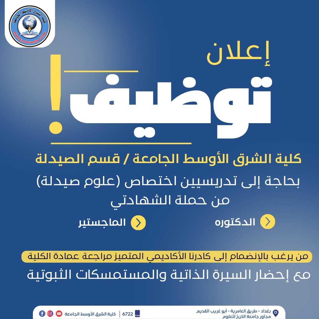 إعلان وظائف في قسم الصيدلة – كلية الشرق الأوسط الجامعة