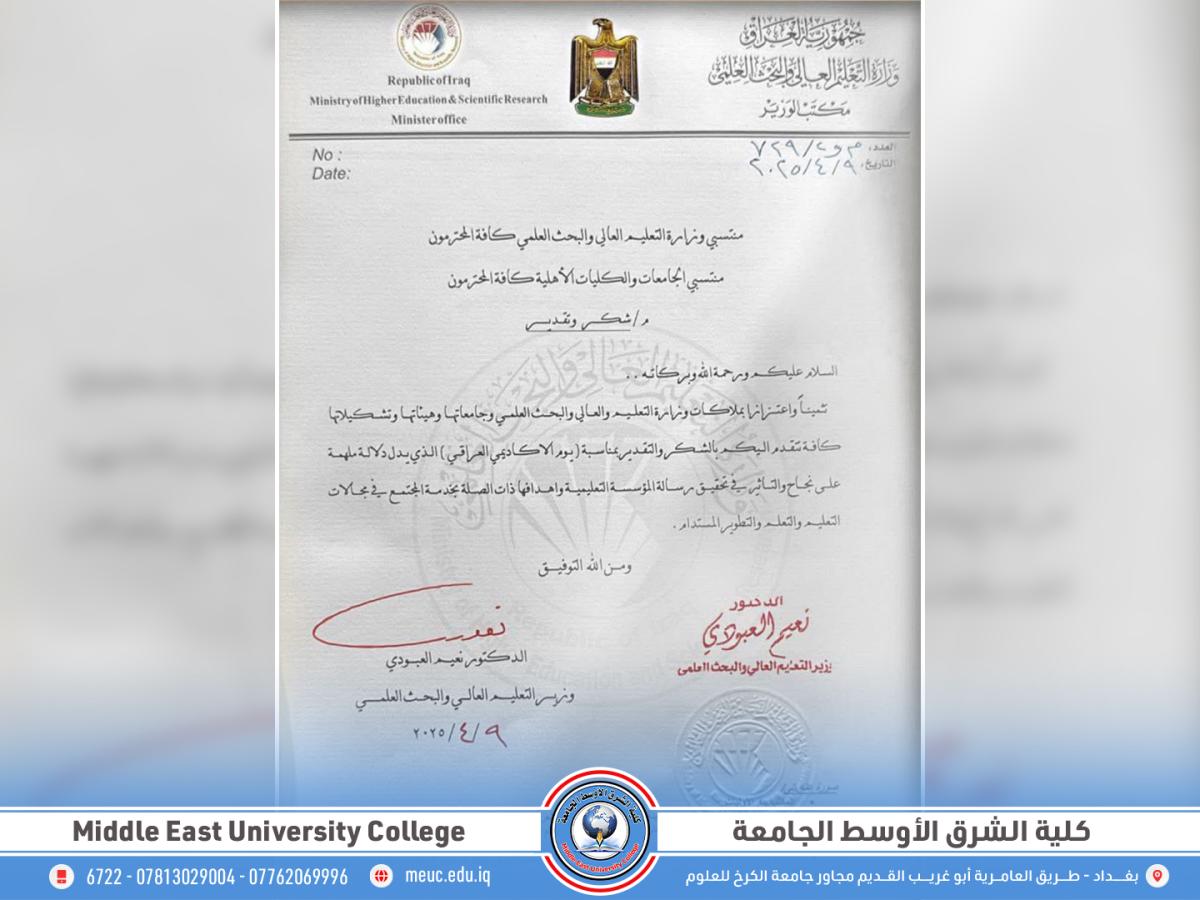 وزير التعليم العالي والبحث العلمي يكرم أحد طلبة كلية الشرق الأوسط الجامعة