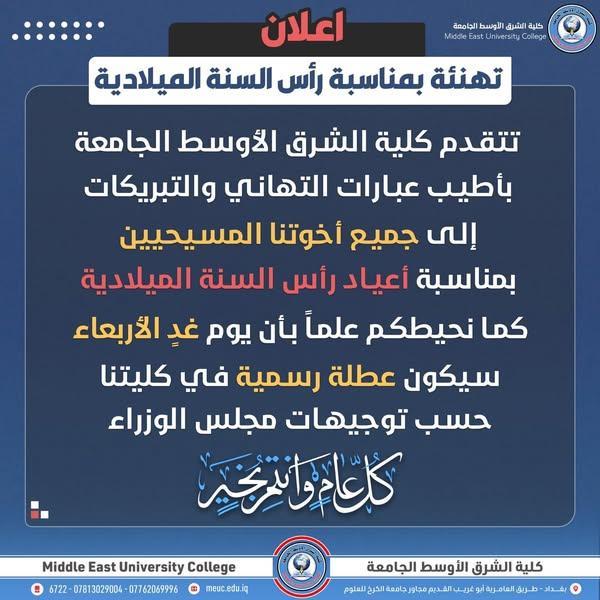 كلية الشرق الاوسط الجامعة تهنئ المسيحيين بالعيد المجيد