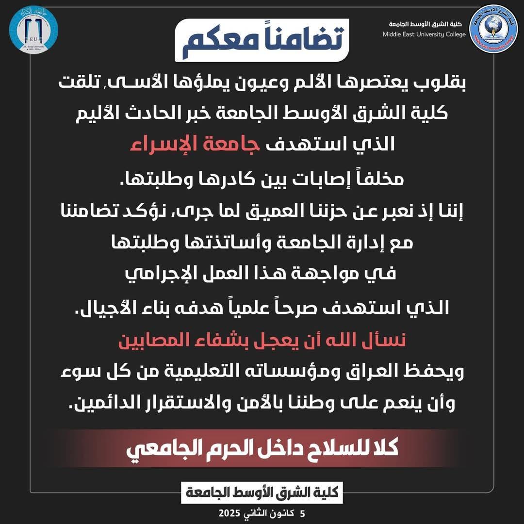كلية الشرق الاوسط الجامعة تعلن تضامن مع جامعة الاسراء