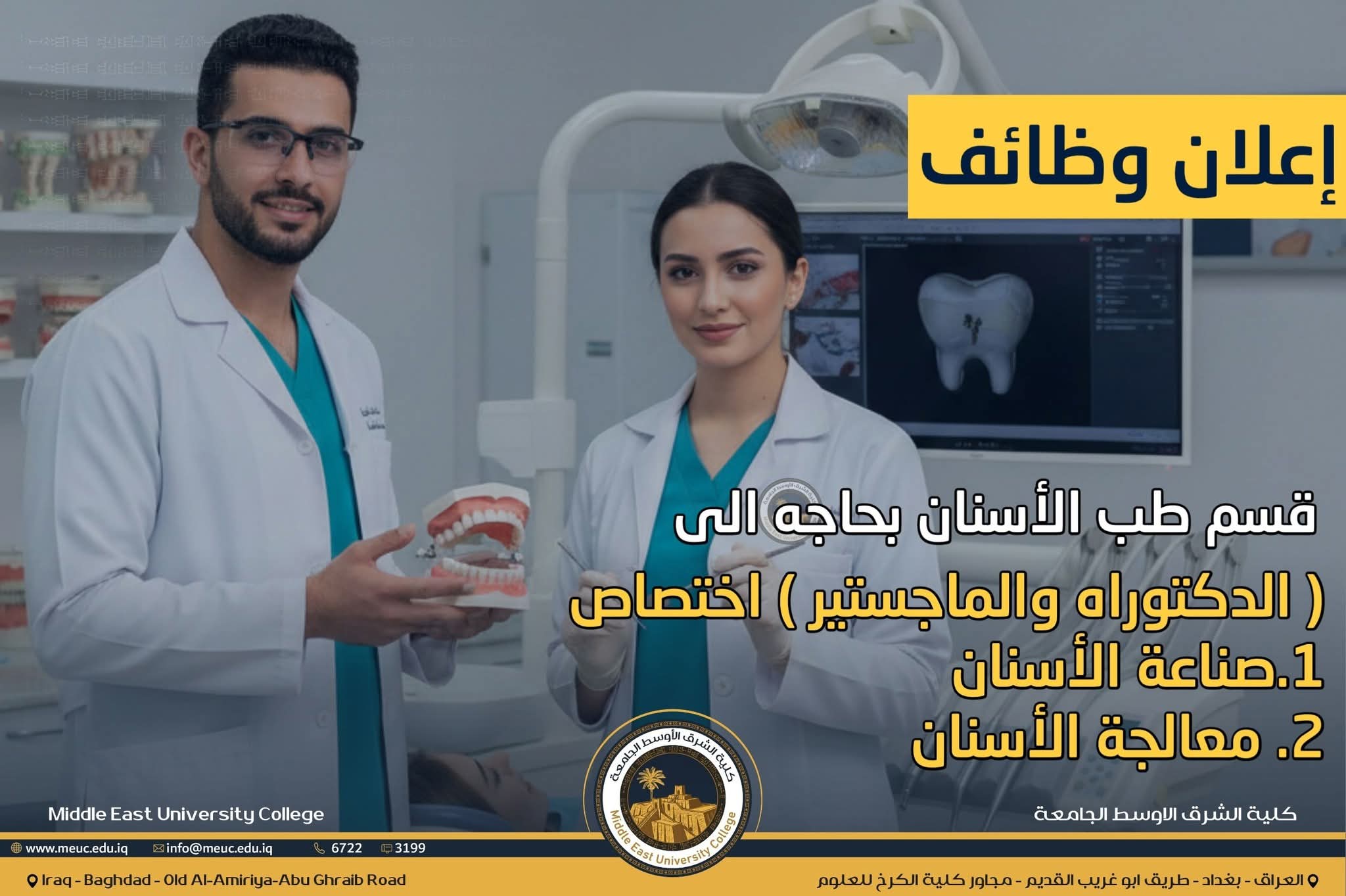 إعلان : مطلوب تدريسيين في قسم طب الأسنان - كلية الشرق الأوسط الجامعة